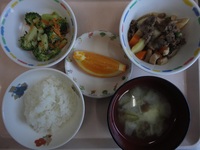 牛肉とじゃが芋の煮物 ブロッコリーの胡麻和え なめこのみそ汁 ごはん オレンジ |