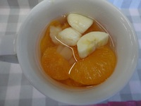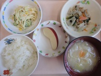 | フルーツポンチ | 野菜たっぷり豚肉の生姜焼き スパゲティサラダ 春野菜のみそ汁 ごはん りんご |
