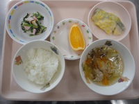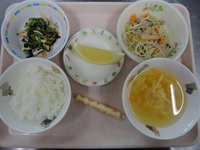 焼きビーフン ほうれん草とささみの酢和え コーン卵スープ チーズ ごはん グレープフルーツ |