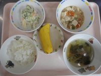 マーボー豆腐 ポテトサラダ しめじとチンゲン菜のスープ ごはん バナナ |