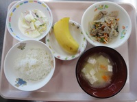 野菜たっぷり豚肉の生姜焼き 白菜サラダ みそ汁(じゃが芋・玉ねぎ) ごはん バナナ |