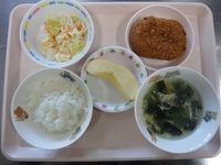 コロッケ 鶏ささみと野菜のたっぷり和え 五目スープ ごはん りんご |