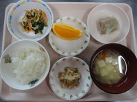 シューマイ 五目和え 納豆 みそ汁(えのき) ごはん オレンジ |