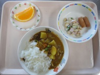 ウインナーソテー 大豆とこんにゃくのサラダ カレーシチュー ごはん オレンジ |