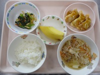 餃子のあんかけ 小松菜とじゃこの和え物 ビーフンスープ ごはん バナナ |
