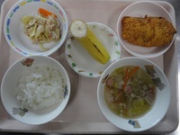 白身フライ キャベツとツナのホットサラダ 押し麦のスープ ごはん バナナ |