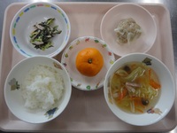 シューマイ 小松菜とひじきのごまマヨ和え キャベツのベーコンスープ ごはん みかん |