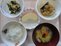 鯖のおろし煮 ほうれん草とささみの酢和え みそ汁(さつま芋) ごはん りんご |