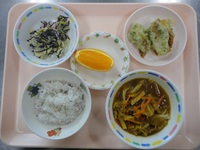 ちくわの磯辺揚げ ひじきサラダ 和風カレーうどん ゆかりごはん オレンジ |