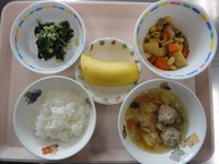 大豆の五目煮 白菜とほうれん草のおかか和え 肉団子スープ ごはん バナナ |