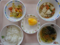 マーボー豆腐 キャベツとコーンの中華和え わかめスープ ごはん 柿 |