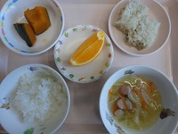 豚肉のもち米蒸し かぼちゃ煮 野菜とウインナーのスープ ごはん オレンジ |