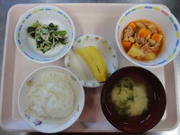 ポークビーンズ 小松菜ともやしのお浸し みそ汁(かぶ) ごはん バナナ |