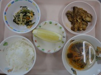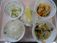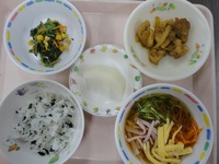 ハニースパイシーチキン 青菜とコーンのごま和え 五目そうめん わかめごはん 梨 |