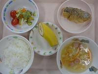 白身魚のごま照り焼き ごま酢キャベツ ミニトマト 野菜とウインナーのスープ ごはん バナナ |