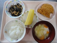 ミンチカツ ひじきの炒り煮 みそ汁 ごはん バナナ |