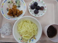 鶏肉の唐揚げ 大豆とこんにゃくのサラダ 流しラーメン ゆかりおにぎり ぶどう |