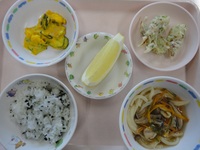 ちくわの磯辺揚げ かぼちゃと卵のサラダ 煮込みうどん わかめごはん グレープフルーツ |