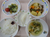 牛肉とじゃが芋の煮物 わかめの酢の物 ミニトマト オクラスープ ごはん 梨 |