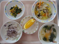 あんかけ焼きそば 青菜とコーンのごま和え ワンタンスープ ゆかりごはん オレンジ |