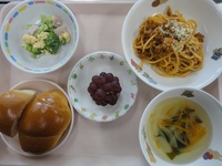ミートスパゲティ ブロッコリーと卵のサラダ わかめスープ(コーン・玉ねぎ) ロールパン ぶどう |