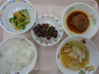 ハンバーグソース煮 ブロッコリーのごま和え キャベツのベーコンスープ ごはん ぶどう |