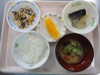 鯖の梅干し煮 炒り豆腐(ツナひじき) 冷やしみそ汁 ごはん オレンジ |