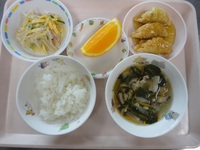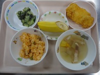 白身フライ わかめの酢の物 冬瓜のベーコンスープ チキンライス バナナ |