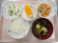 筑前煮 ハムサラダ すまし汁 ごはん オレンジ |