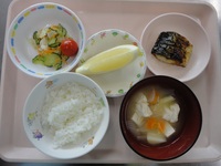 | 米粉パンケーキ(抹茶) | 焼き鯖 ごま酢キャベツ トマト みそ汁(じゃが芋、玉ねぎ) ごはん グレープフルーツ |