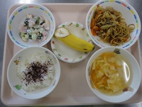 焼きそば 大豆とこんにゃくのサラダ 卵スープ ゆかりごはん バナナ |