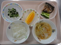 焼き鯖 スティックきゅうり ほうれん草ともやしのごま和え ビーフンスープ ごはん オレンジ |