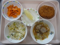 コロッケ チーズ 人参の和風サラダ 肉団子スープ 青菜チャーハン グレープフルーツ |