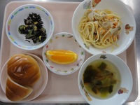 チキンときのこのクリームパスタ ひじきときゅうりのサラダ わかめスープ ロールパン オレンジ |