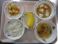 マーボー豆腐 キャベツとコーンの中華和え しめじとチンゲン菜のスープ ごはん バナナ |