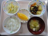 じゃが芋のひじき煮 マカロニサラダ みそ汁 ごはん オレンジ |