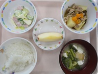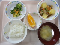| マカロニあべかわ | 牛肉とじゃが芋の煮物 ブロッコリーのごま和え なめこのみそ汁 ごはん オレンジ |