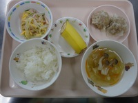 | フルーツヨーグルト | シューマイ 冷ばん三すう コンソメスープ ごはん バナナ |