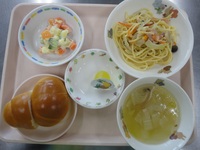 | 昆布おにぎり | チキンときのこのクリームパスタ マセドアンサラダ 白菜のベーコンスープ ロールパン ゼリー |