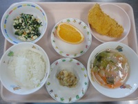 白身フライ ほうれん草の白和え ワンタンスープ ごはん 納豆 はっさく |
