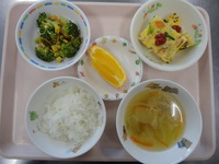 スパニッシュオムレツ ブロッコリーとコーンのおかか和え 野菜とウインナーのスープ ごはん オレンジ |