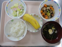 じゃが芋のひじき煮 ハムサラダ 麩のすまし汁 ごはん バナナ |