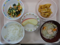 餃子のあんかけ 小松菜の中華和え 石狩汁 ごはん りんご |