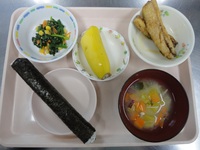 イワシのかば焼き 青菜とコーンのごま和え みそ汁(さつま芋) 細巻き バナナ |