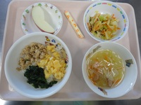 そぼろ丼 キャベツの昆布和え 野菜とウインナーのスープ チーズ りんご |
