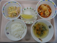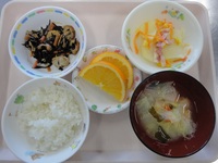 ポテトとコーンの重ね煮 ひじきの炒り煮 厚揚げと大根の味噌汁 ごはん オレンジ |