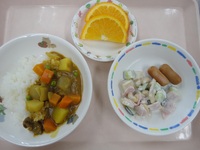 ウインナー 大豆とこんにゃくのサラダ カレーシチュー ごはん オレンジ |