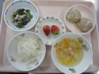 しゅうまい 小松菜とひじきのごまマヨ和え キャベツのベーコンスープ ごはん いちご |