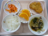 とんかつ にんじんの和風サラダ わかめスープ ごはん オレンジ |