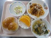 ミートスパゲティ 白菜サラダ かぶとベーコンのスープ ロールパン オレンジ |